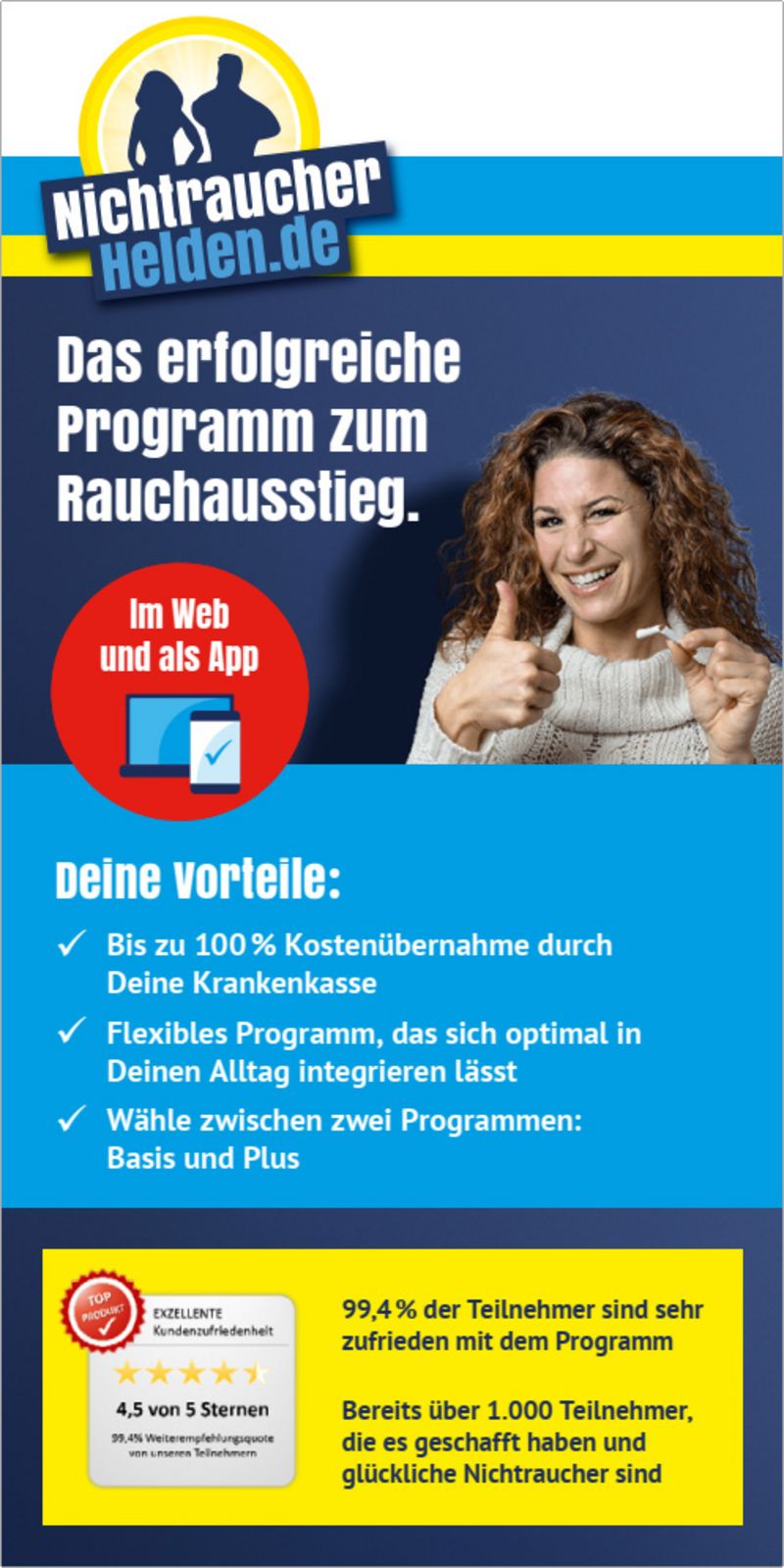 Für mehr als einen schnellen Hinweis, dass der Patient seinen Zähnen zuliebe besser mit dem Rauchen aufhören sollte, reicht die Zeit im Praxisalltag nicht. Eine umfassende Beratung ist zu zeitaufwendig. Genau dies übernimmt unser Kooperationspartner NichtraucherHelden.de mit seinem zertifizierten Online-Nichtraucherprogramm für Sie.